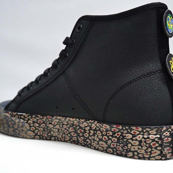 重厚なブラックのレザーアッパーにオリジナルのグラフィックプリントが施されたフォクシングテープ、そしてベルクロ素材のヒールにマジックテープ仕様で取り外し可能なパッチが付属するカスタム可能なユニークな1足です。